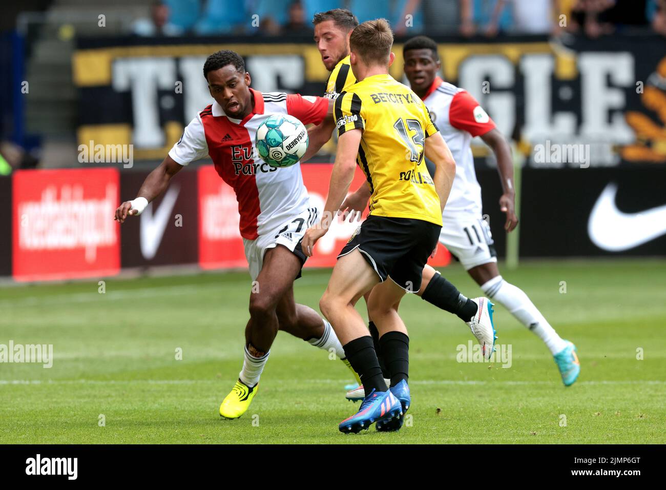Arnhem Lr Quinten Timber Von Feyenoord Maximilian Wittek Von Vitesse Enzo Cornelisse Von Vitesse Wahrend Des Niederlandischen Eredivisie Spiels Zwischen Vitesse Und Feyenoord Beim Gelredome Am 7 August 2022 In Arnhem Niederlande